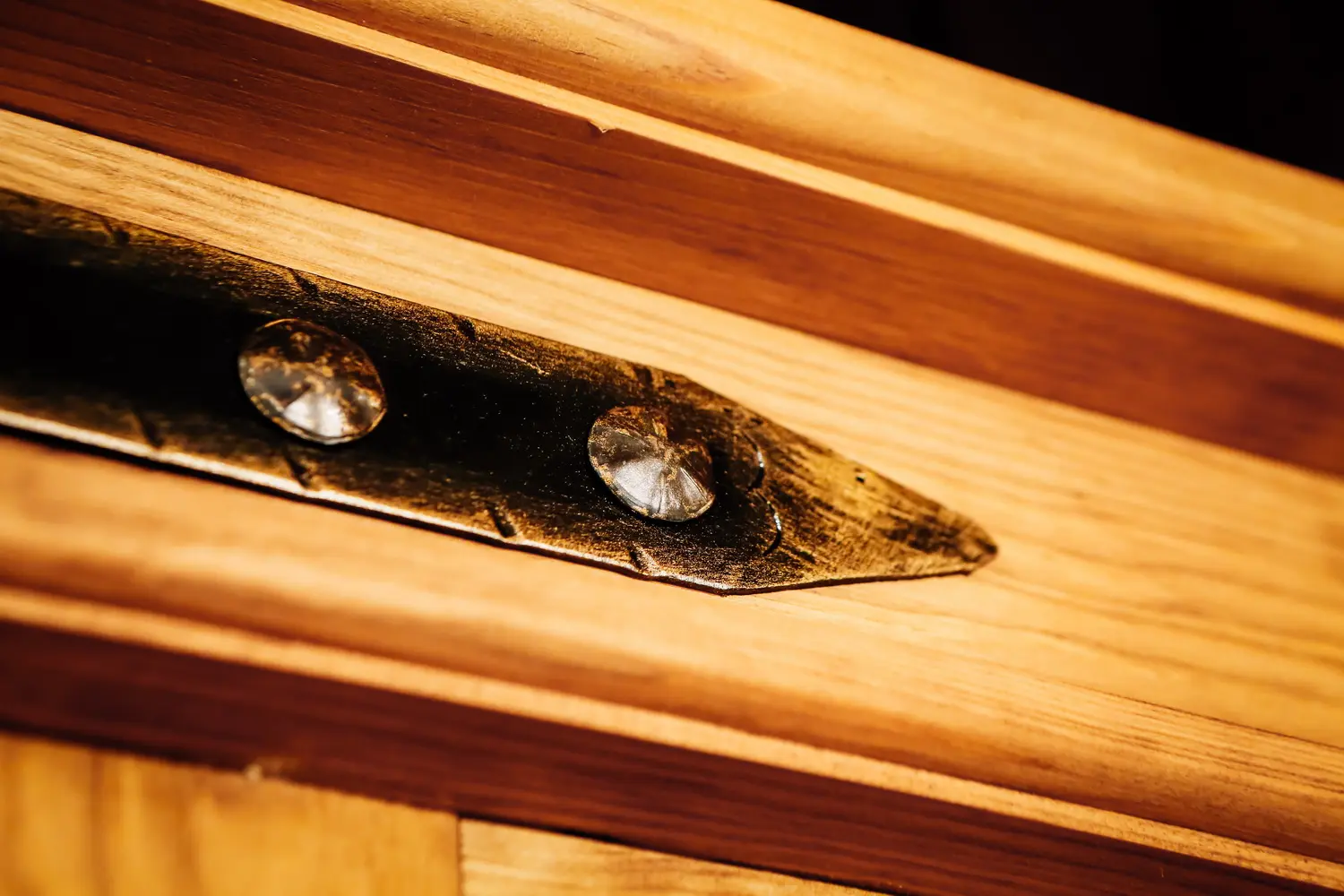 Буфет для дома Викинг-01 изготовлен из массива сосны - прочного и долговечного экологически чистого материала. Вся фурнитура (ручки дверец, уголки, петли) и элементы декора вручную выкованы из высококачественного металла. При производстве мебели из коллекции Викинг используется традиционная технология искусственного состаривания материала, которая предполагает пропитку древесины натуральным воском. Кроме эстетического эффекта под старину, такая обработка придает мебели дополнительную устойчивость к атмосферным и механическим воздействиям.