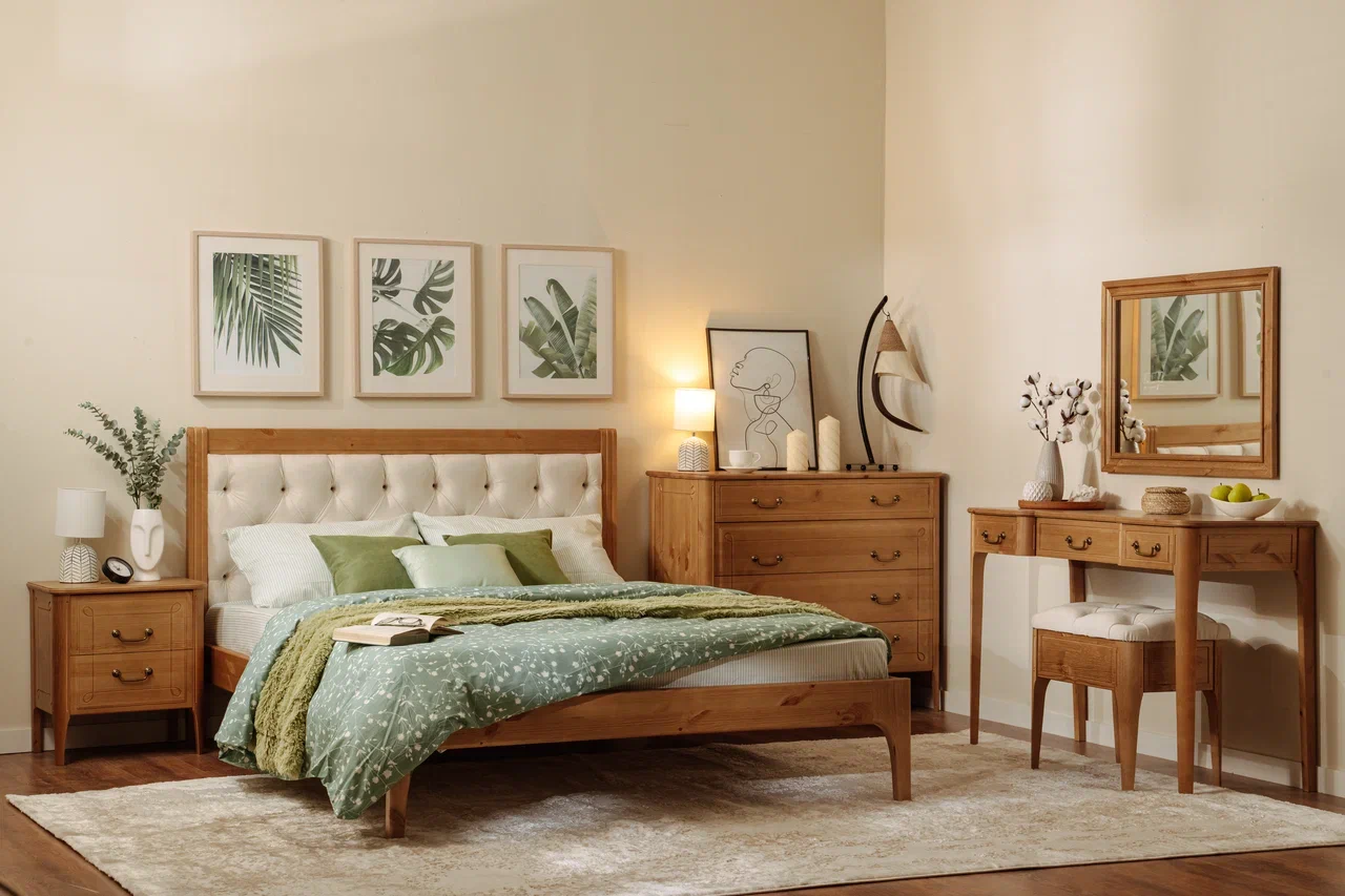 Коллекция «Бетти» – это стильные шкафы, кровати, тумбы, стеллажи, серванты, комоды, тумбы и сундуки для спален, гостиных, прихожих. Для изготовления корпуса и фасадов используется натуральное дерево – массив сосны. Задние стенки и дно ящиков изготавливаются из ДВП.