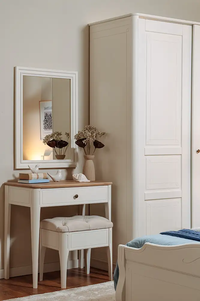 На дверцах и ящиках сделаны деревянные ручки-кнопки. По умолчанию изделия предлагаются в бесцветном лаке, есть возможность окраски в цвет, выбранный производителем. На выбор простые и сложные эмали, а также эмали с эффектами.