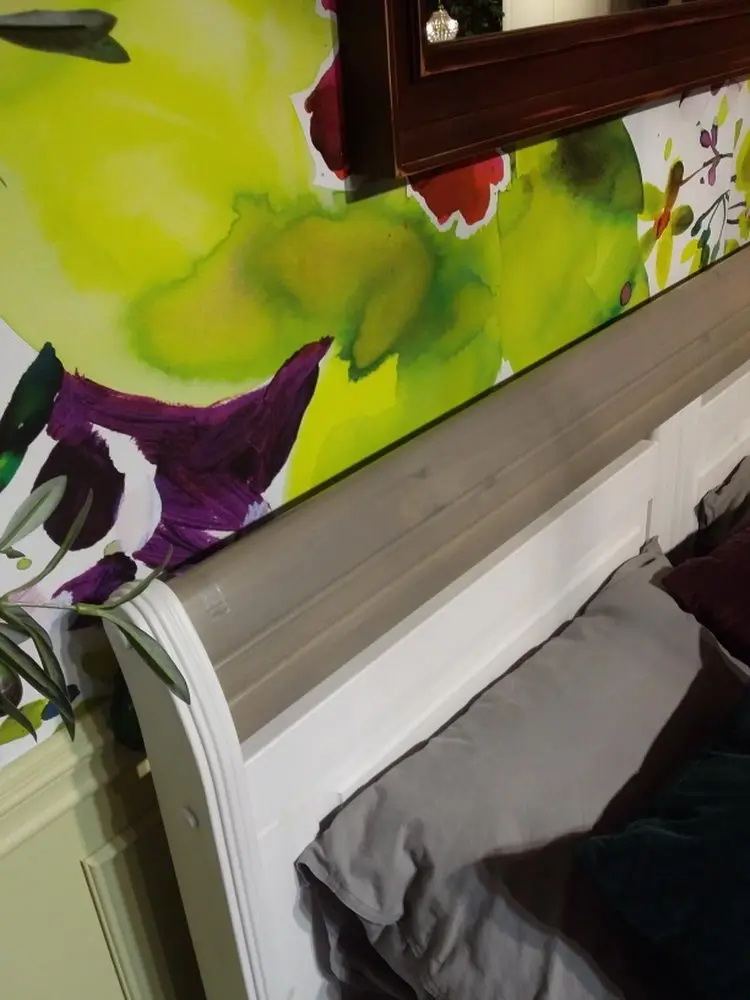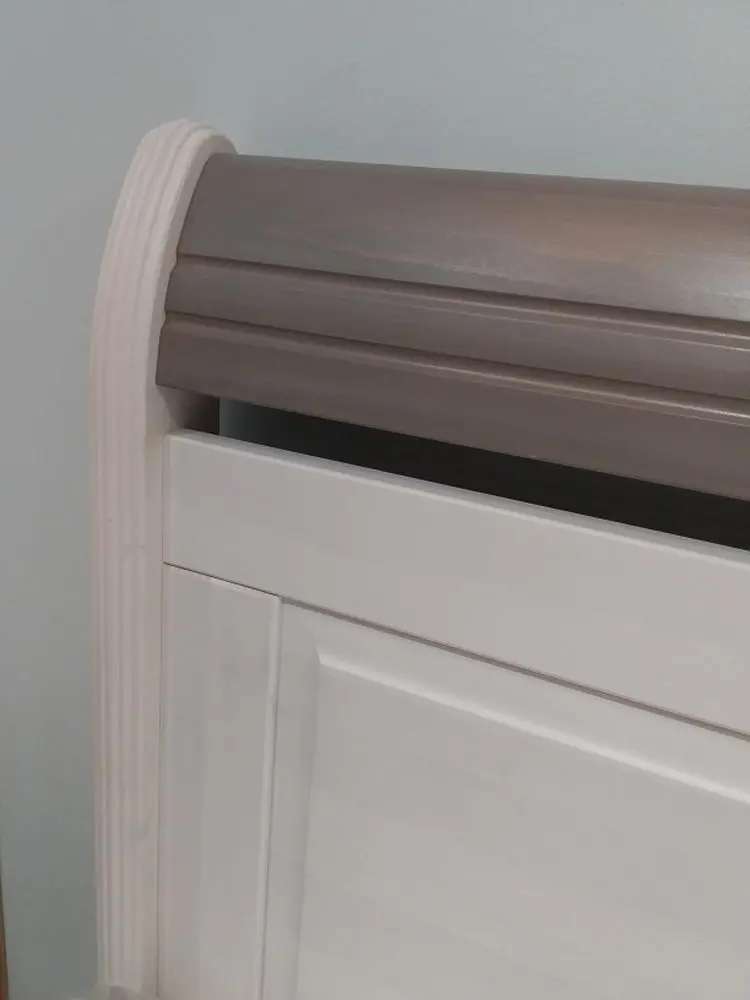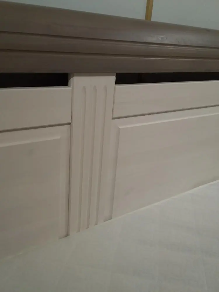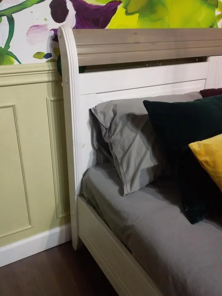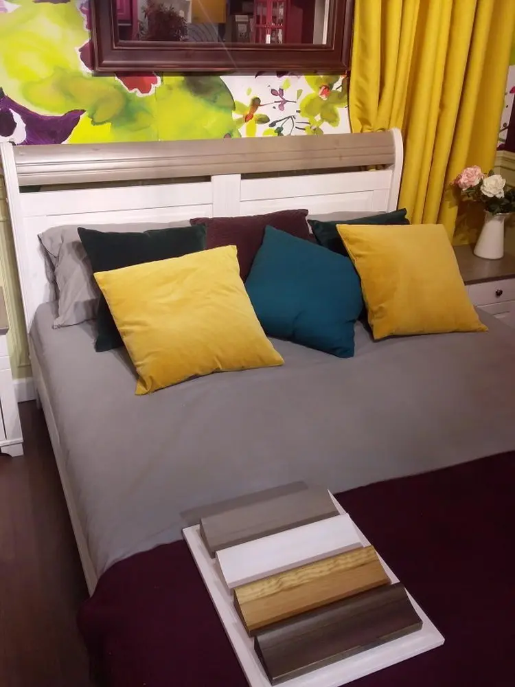 Кровать поставляется в цвете – белый воск. Комбинация цвета белый воск/антик и белый воск/антрацит (серый) подразумевает отделку элемента изголовья кровати. Структура древесины под покрытием просматривается, что безусловно украшает коллекцию и является показателем натуральности мебели.