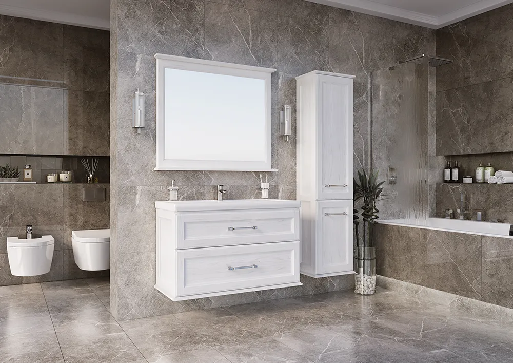 Предметы мебели изготавливаются из массива ясеня и из МДФ. Ручки имеют влагостойкое матовое покрытие. Производитель уделяет внимание и функциональности: дверцы оснащены доводчиками для мягкого открывания и закрывания, ящики выдвигаются плавно и бесшумно.