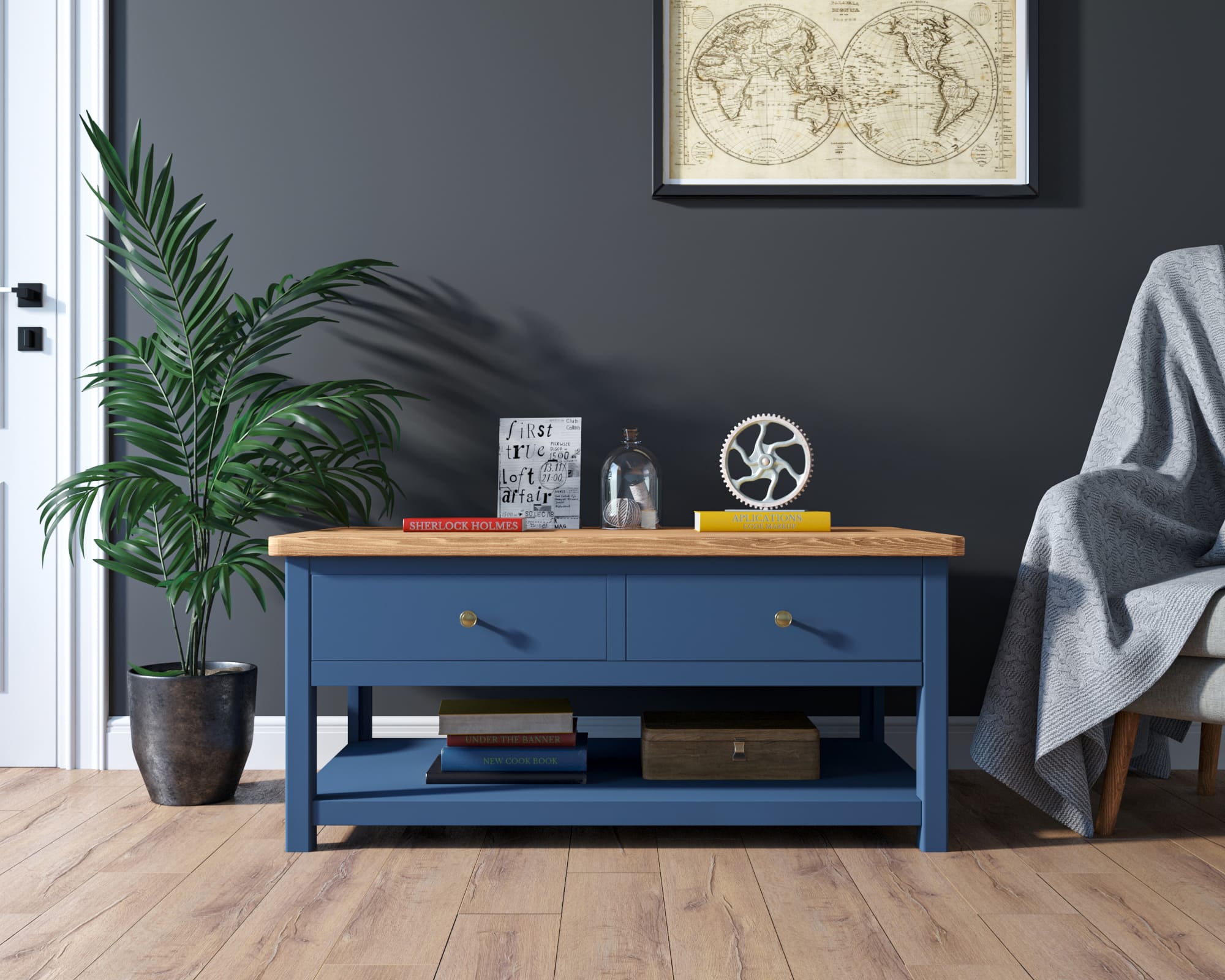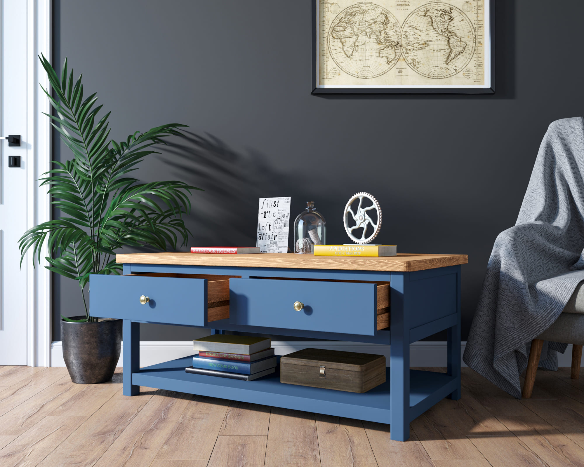 Наполнение: 2 выдвижных ящика, внизу открытая полка.