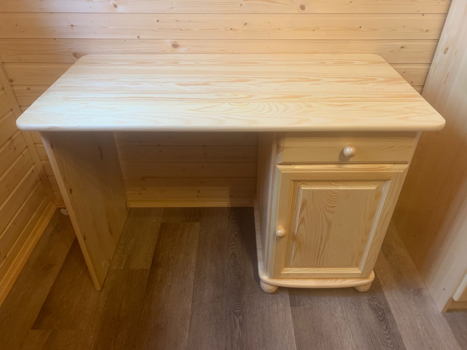 Широкая поверхность стола удобна для письма, чтения или работы на ПК. Она покрыта матовым бесцветным мебельным лаком «нц», который защищает дерево от старения и воздействия внешних факторов окружающей среды. Такое покрытие безопасно для здоровья человека и домашних животных.