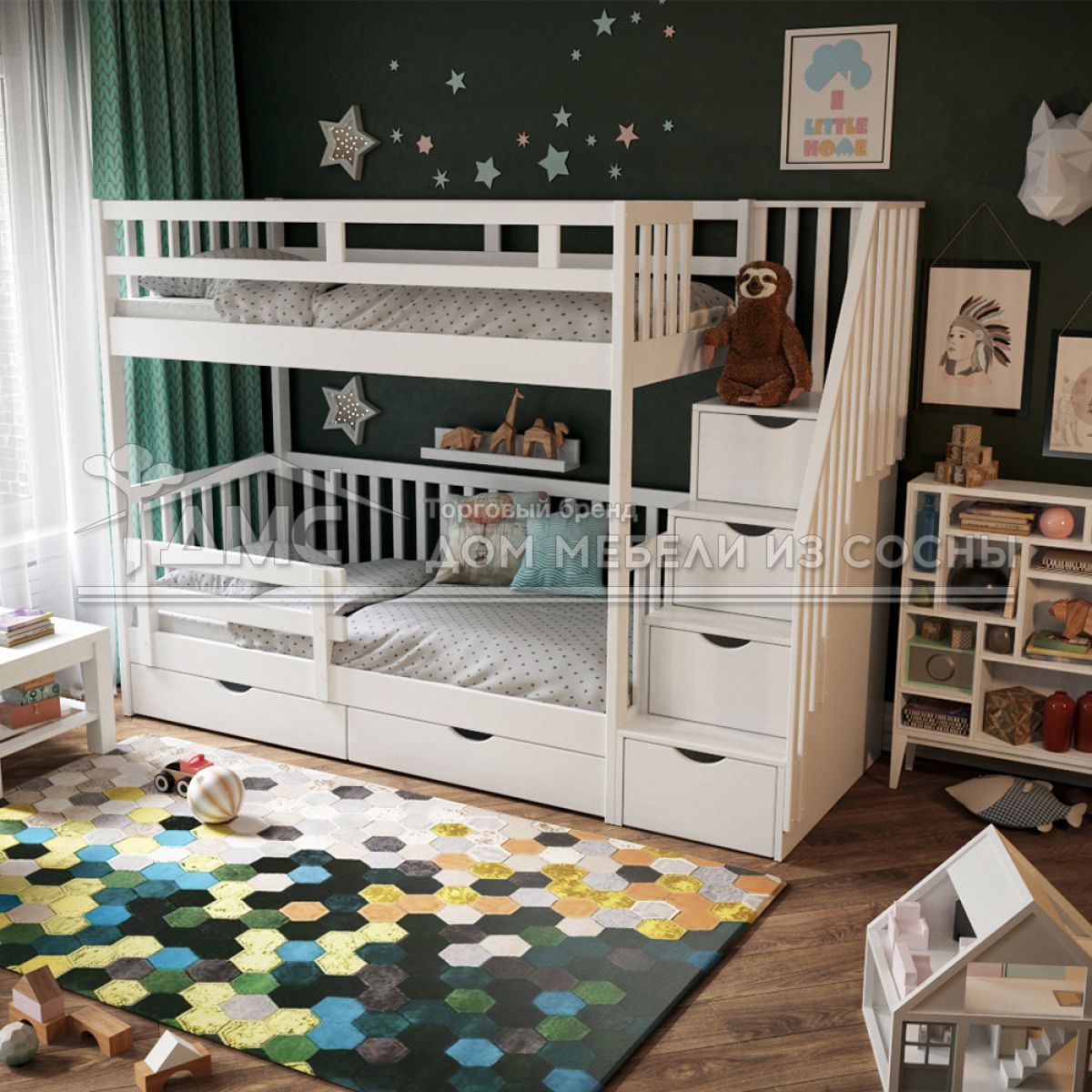 Особенностью конструкции является то, что для подъёма на второй этаж используются не лестницы, а удобные ступеньки, которые также выполняют роль дополнительной системы хранения. Это делает кровать не только функциональной, но и стильной.