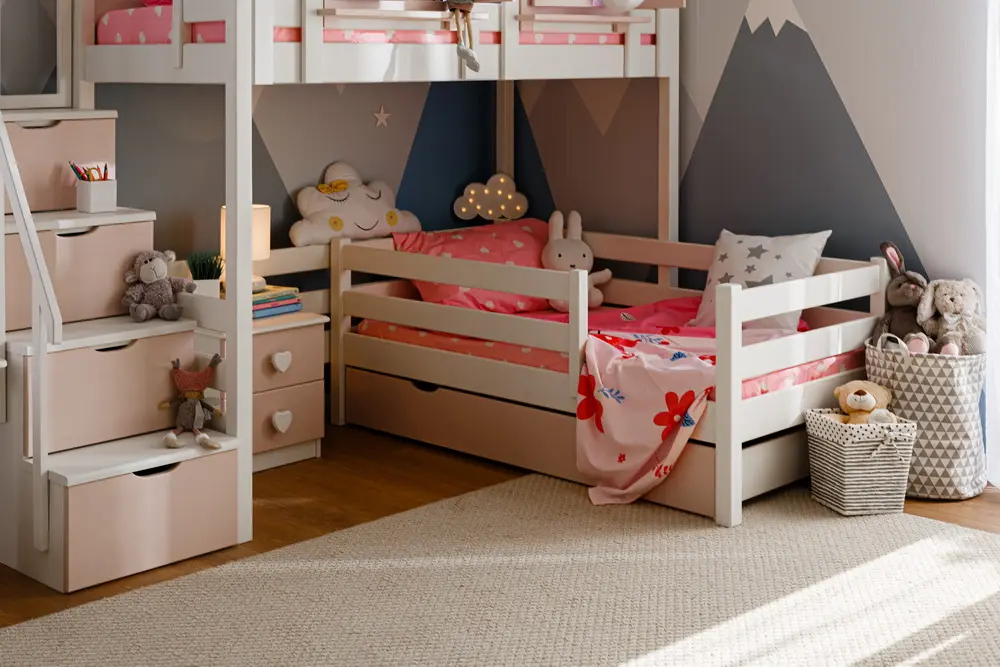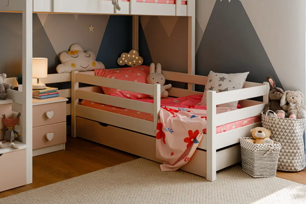 Ящики не входят в комплект кровати и заказываются отдельно. Мы предлагаем ящики разных размеров и цветов. Ящики изготовлены из массива сосны и оснащены роликовыми направляющими. Они легко выдвигаются и задвигаются, а также имеют плавный ход.
