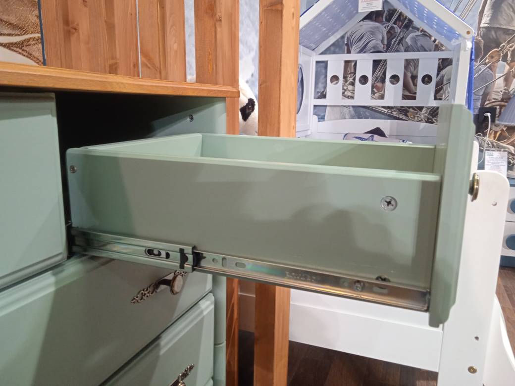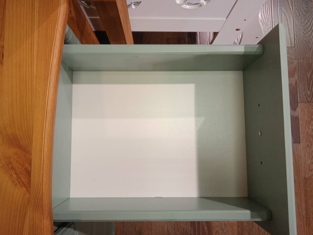 Материал - сосна, задняя стенка, дно ящиков - ДВП белого цвета.