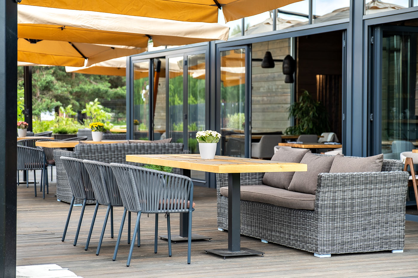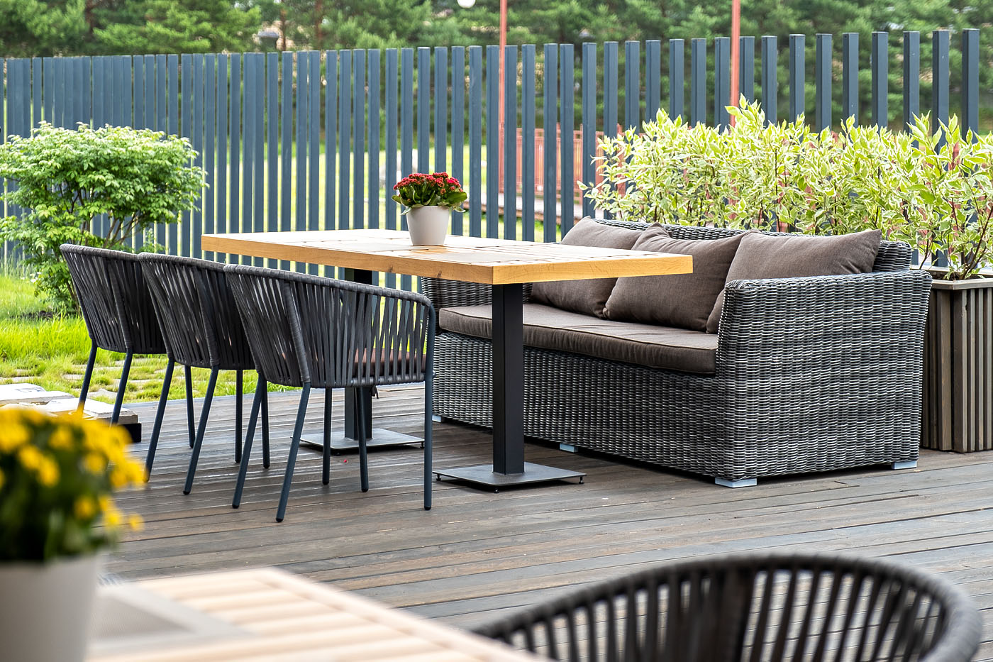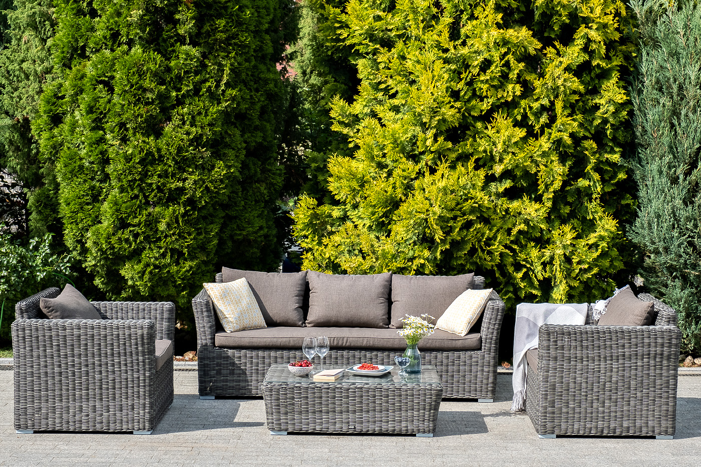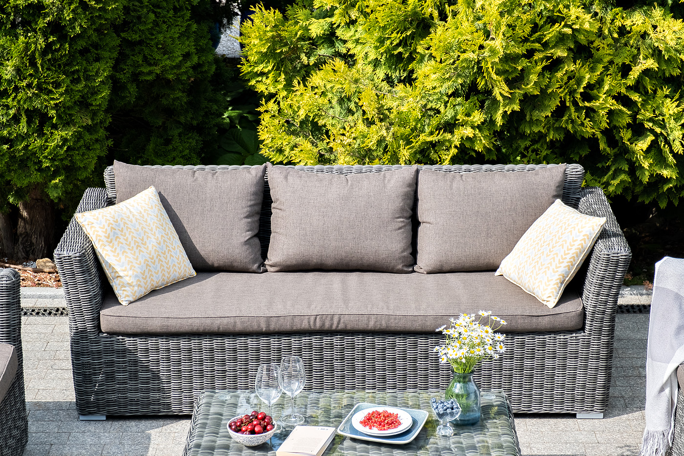 Диван из искусственного ротанга "Капуто" в своей основе имеет каркас из алюминия, который оплетен вручную круглым плетением графитового цвета. Размеры модели: 2220×865×815 мм, которые позволяют разместить трех человек. Подушки, входящие в комплект, выполнены из высококачественного полиэстера с влагоотталкивающей пропиткой.