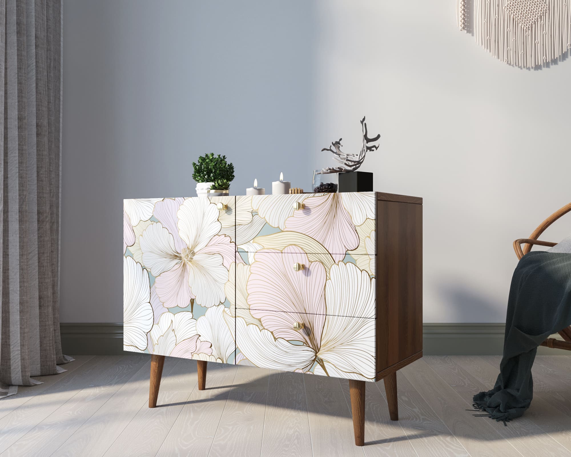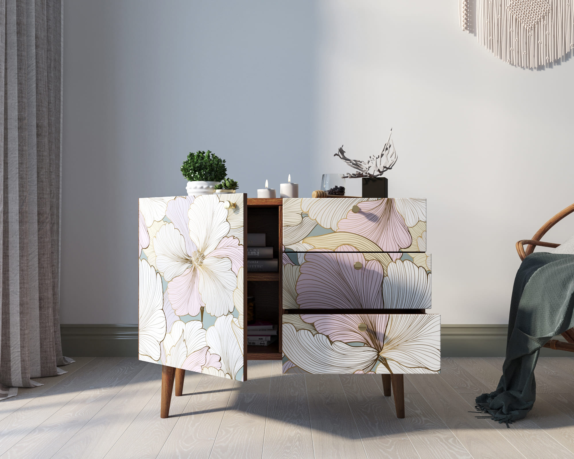 В компактном комоде три ящика и полка в левой секции за дверкой. Фасад украшает принт в спокойных тонах. Петли на дверях с доводчиком, ящики на шариковых направляющих. Для изготовления модели применены два вида материалов: ЛДСП для корпуса и массив ясеня для ножек.