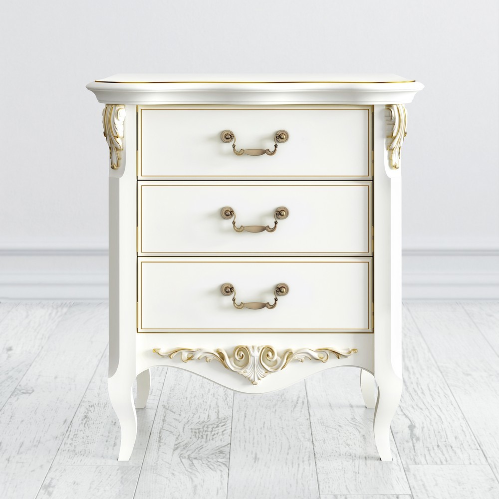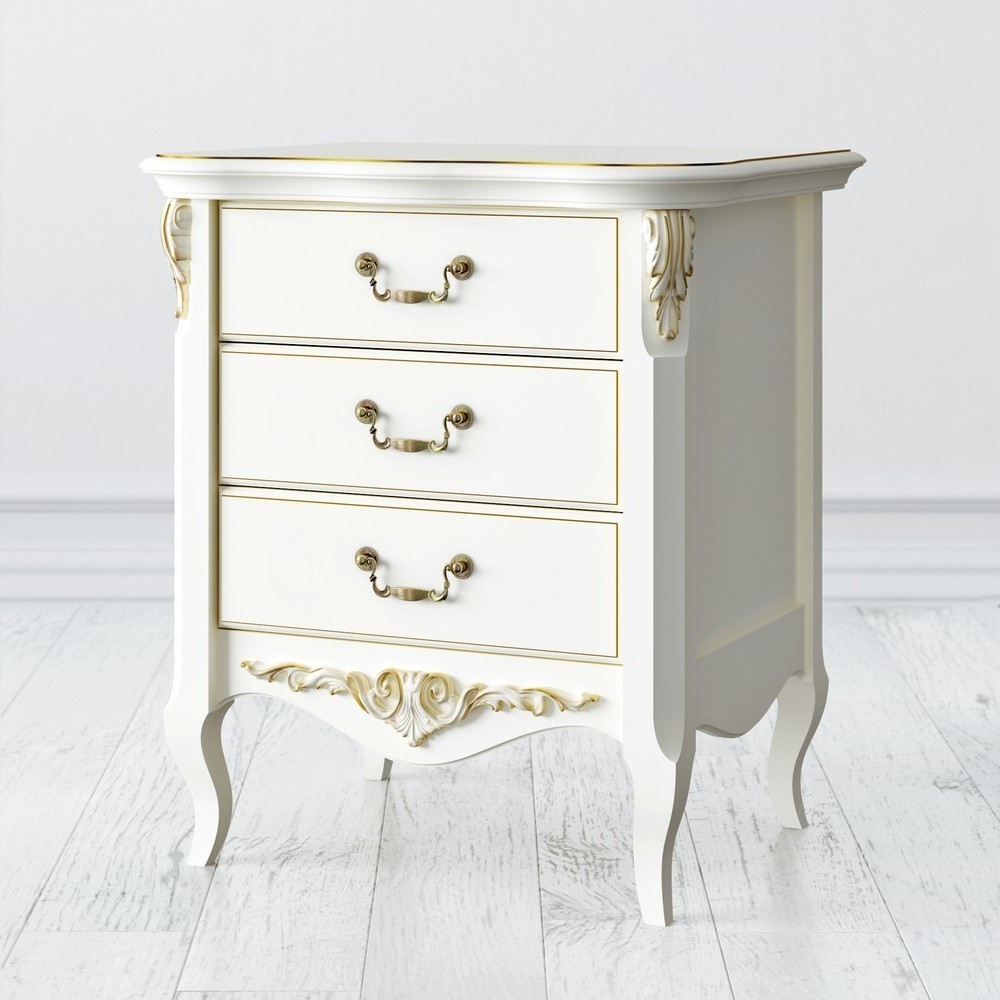 Отличительной чертой этой прикроватной тумбы является изысканный внешний вид и большая вместительность благодаря трем выдвижным ящикам. В качестве основного материала использовался массив бука, который окрашен в цвет «слоновая кость» и дополнен золотой патиной. Такая комбинация подчеркивает изысканный внешний вид и придает изделию нотки роскоши и аристократического шика. Декоративные элементы на корпусе и фасадах тумбы имитирует ручную резьбу по дереву. Сборка не требуется.